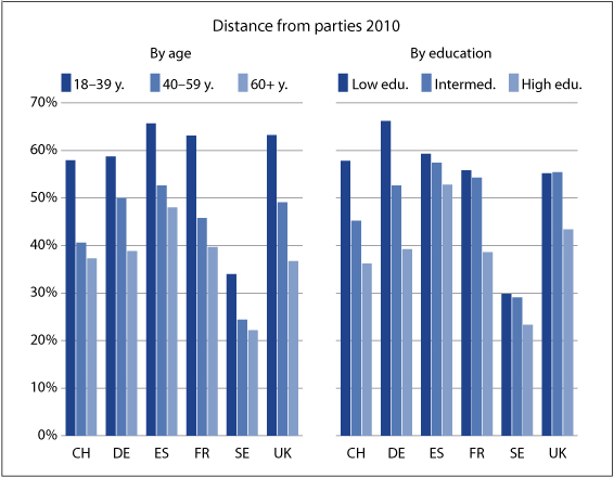 Question wording: distance from parties: “Is there a particular political party you feel closer to than all the other parties?” Answer categories: Yes, No. Percentages correspond to the proportion of No answers.