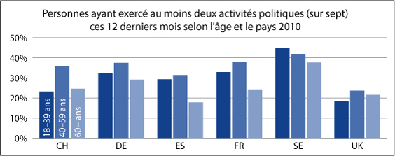 Question posée : « Avez-vous entrepris l’une des choses suivantes au cours des 12 derniers mois ? Contacter un politicien ou un représentant du gouvernement fédéral, de l’administration cantonale ou communale. Œuvrer au sein d’un parti ou d’un autre groupement politique. Œuvrer au sein d’une organisation ou d’une association, quelle qu’elle soit. Porter sur soi un badge ou un autocollant en faveur d’une campagne ou le placer quelque part. Signer une pétition. Participer à une manifestation autorisée. Boycotter un produit. »