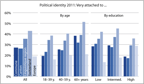 Question wording: “It is possible to feel varying degrees of attachment to one’s commune, canton, linguistic region, country and Europe. Please tell me how strongly you identify with your commune, canton, linguistic region, the whole country, Switzerland, and Europe as a continent.” Percentages correspond to the share of respondents who indicated that they identified strongly.