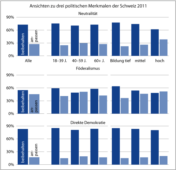 Fragestellung: «Die Schweiz ist geprägt von speziellen politischen Einrichtungen. Wir interessieren uns hier für drei davon, die Neutralität, der Föderalismus und die direkte Demokratie. Was denken Sie persönlich, inwieweit sollen jede von ihnen unverändert bleiben oder angepasst werden?»