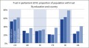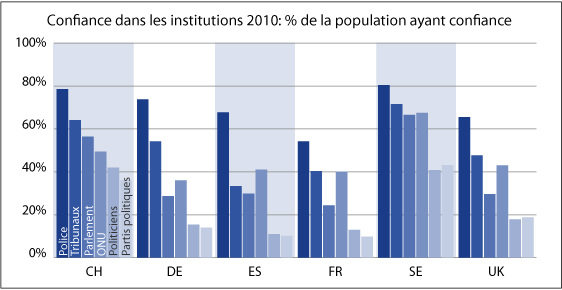 Question posée : « Veuillez me dire comment vous évalueriez personnellement le degré de confiance que vous accordez à la police, aux tribunaux, au Parlement, à l’ONU, au personnel politique et aux partis politiques. » Dans chaque cas est mentionnée la part des personnes interrogées qui ont indiqué des valeurs se situant entre 6 et 10 sur une échelle de 0 à 10.