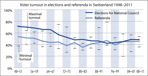 Referenda: average, maximal and minimal turnout per legislative period.