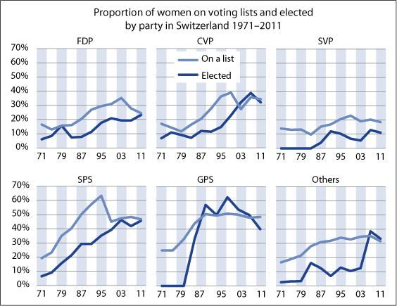 Women on voting lists and women elected by party in Switzerland 1971-2011