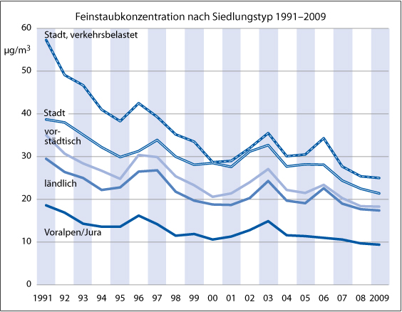 Standorttypen: Stadt, verkehrsbelastet: Stadtzentrum, an Hauptverkehrsachse; Stadt: Stadtzentrum, in Parkanlage; Voralpen/ Jura: oberhalb 1000 m ü. M.
