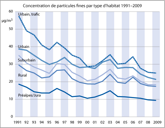 Types de site : urbain, trafic : centre-ville, sur les axes de trafic principaux ; urbain, suburbain : centre-ville, à proximité de parc ; Préalpes/ Jura : altitude < 1000 mètres.