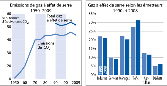 Gaz à effet de serre : dioxyde de carbone (CO2), méthane (CH4), protoxyde d’azote (N2O), gaz synthétiques. Nouvelle méthode de mesure du CO2 depuis 1990.
