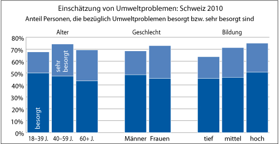 Fragestellung: “Wie besorgt sind Sie im Grossen und Ganzen in Bezug auf Umweltprobleme? Antworten Sie bitte mit einer Zahl zwischen 1 und 5, wo 1 bedeutet, dass Sie überhaupt nicht besorgt sind, und 5, dass Sie sehr besorgt sind.” Angeführt sind %-Anteile besorgt/sehr besorgt (Werte 4 & 5)
