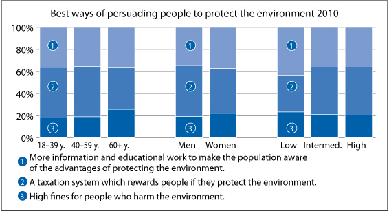Question wording: “In your opinion, which of the following would be the best way to persuade people and their families in Switzerland to protect the environment? A: More information and educational work to make the population aware of the advantages of protecting the environment, B: A taxation system which rewards people if they protect the environment, C: High fines for people who harm the environment.”