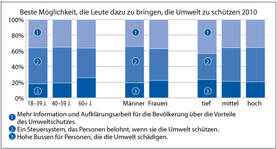 Fragestellung: «Welche der folgenden Möglichkeiten wäre Ihrer Meinung nach die beste, um die Leute und deren Familien in der Schweiz dazu zu bringen, die Umwelt zu schützen? 1) Mehr Informationen und Aufklärungsarbeit für die Bevölkerung über die Vorteile des Umweltschutzes, 2) Ein Steuersystem, das Personen belohnt, wenn sie die Umwelt schützen, 3) Hohe Bussen für Personen, die die Umwelt schädigen .»
