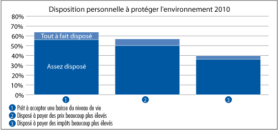 Questions posées : « Dans quelle mesure seriez-vous personnellement disposé à payer des prix beaucoup plus élevés et des impôts beaucoup plus élevés pour protéger l’environnement ? Et dans quelle mesure seriez-vous personnellement prêt à consentir à une baisse de votre niveau de vie pour protéger l’environnement ? »