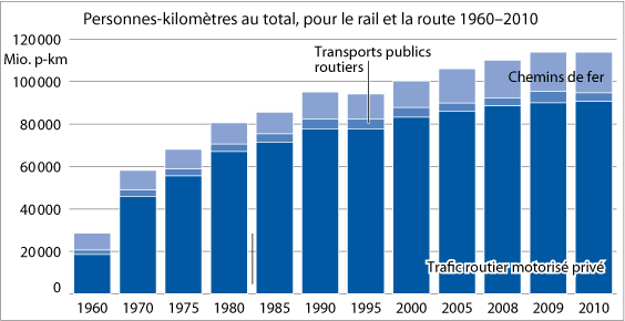 Personnes-kilomètres (total) pour le rail et la route 1960-2010