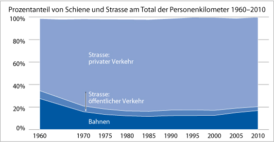 Anteil von Schiene und Strasse am Total Personenkilometer 1960-2010