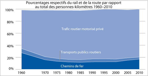 Part du rail et de la route par rapport au total des personnes-kilomètres 1960-2010