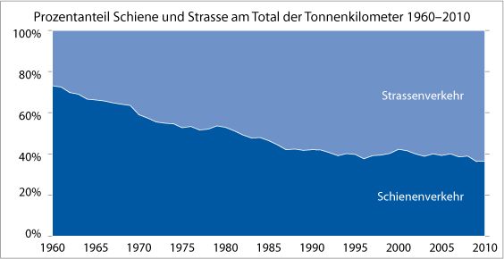 Güterverkehr: Anteil Schiene and Strasse 1960-2010