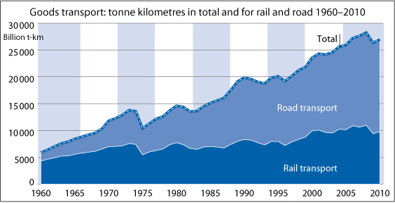 Goods transport: tonne kilometers (total) for rail and road 1960-2010