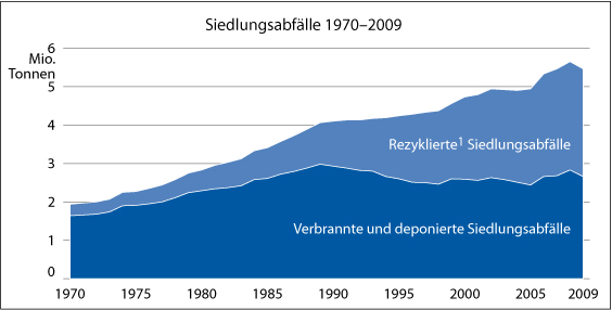 Siedlungsabfälle: Total aus Kompost, Papier und Karton, Glas, Weissblech, Alu, PET, Textilien, Batterien und seit 2001 inkl. elektrische und elektronische Geräte. Seit 2004 ohne Importe.