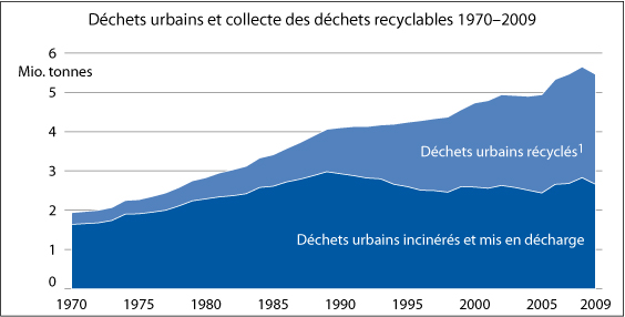 Déchets urbains : total des déchets comprenant : compost, papier et carton, verre, fer-blanc, aluminium, PET, textiles, piles usagées et, dès 2001, appareils électriques et électroniques. Dès 2004, sans les importations.