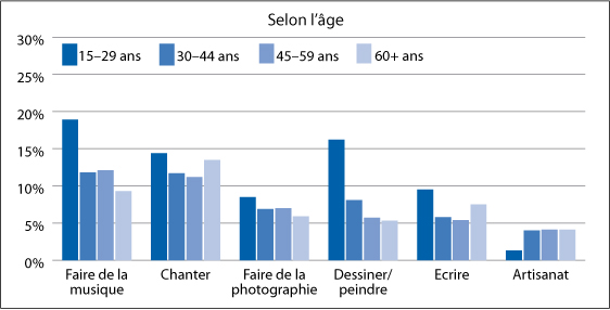 Question posée : « Au cours des 12 derniers mois, avez-vous joué d’un instrument, seul ou en groupe / dans un ensemble ; pratiqué régulièrement le chant, seul ou en groupe ; fait des photos d’amateur (hormis les photos de famille et de vacances) ; dessiné, peint, sculpté ou gravé ; écrit des poèmes, des nouvelles, des romans ou tenu un journal (lettres de correspondance exclues) ; fait de la poterie, des objets en céramique, ou pratiqué une autre sorte d’artisanat d’art ? »