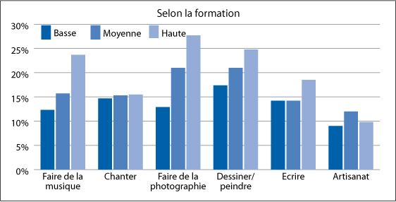 Question posée : « Au cours des 12 derniers mois, avez-vous joué d’un instrument, seul ou en groupe / dans un ensemble ; pratiqué régulièrement le chant, seul ou en groupe ; fait des photos d’amateur (hormis les photos de famille et de vacances) ; dessiné, peint, sculpté ou gravé ; écrit des poèmes, des nouvelles, des romans ou tenu un journal (lettres de correspondance exclues) ; fait de la poterie, des objets en céramique, ou pratiqué une autre sorte d’artisanat d’art ? »