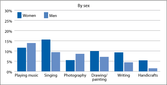 Question wording: “During the last 12 months, have you played a musical instrument, whether alone or as part of a group; regularly sung, whether alone or in a group; practised amateur photography (not including family or holiday photos); done drawing, painting, sculpture or engraving; written poetry, short stories, novels or a diary (not including letters); made pottery or done any other handicraft?”