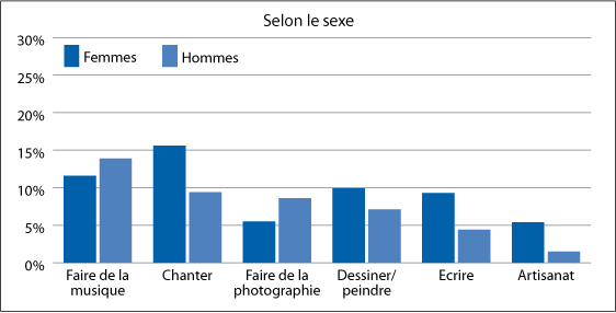 Question posée : « Au cours des 12 derniers mois, avez-vous joué d’un instrument, seul ou en groupe / dans un ensemble ; pratiqué régulièrement le chant, seul ou en groupe ; fait des photos d’amateur (hormis les photos de famille et de vacances) ; dessiné, peint, sculpté ou gravé ; écrit des poèmes, des nouvelles, des romans ou tenu un journal (lettres de correspondance exclues) ; fait de la poterie, des objets en céramique, ou pratiqué une autre sorte d’artisanat d’art ? »