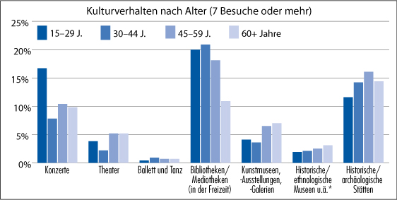 Fragestellung: «Sind Sie in den letzten 12 Monaten an einem Konzert oder Musikanlass; im Theater (Pantomime und Kindertheater inklusive); an einer Ballett- oder Tanzaufführung; in einer Bibliothek/ Mediathek; in einem Kunstmuseum, einer Kunstaustellung oder einer Kunstgalerie; in einem Museum oder Ausstellung (historisch, ethnologisch, wissenschaftlich, technisch, regional usw.); an einer historischen oder archäologischen Stätte gewesen?»