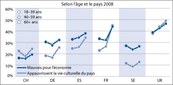 Catégories de réponse : question 1 : échelle de 0 (nuisible pour l’économie) à 10 (bénéfique pour l’économie). Question 2 : échelle de 0 (sapent la vie culturelle) à 10 (enrichissent la vie culturelle). Sont indiqués les pourcentages de personnes interrogées qui ont attribué des valeurs allant de 0 à 4.