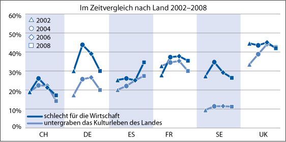 “Zuwanderer sind schlecht für die Wirtschaft” und “Zuwanderer untergraben das Kulturleben des Landes”, im Zeitvergleich 2002-2008