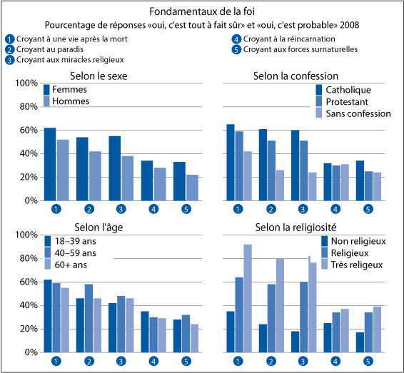 Question posée : « Croyez-vous… à une vie après la mort ? Que le ciel existe ? Qu’il y ait des miracles religieux ? Croyez-vous à la réincarnation, ce qui veut dire que l’on va sans cesse renaître dans ce monde ? Croyez-vous aux forces surnaturelles d’ancêtres défunts ? »