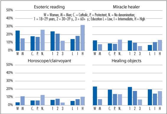 Question wording: “During the past year have you done any of the following: read a book or magazine on esoteric or alternative spirituality? Had your horoscope prepared or used a fortune-teller? Used spiritual healing techniques or a healer? Used healing, or protective or lucky objects such as stones, crystals and lucky charms?”
