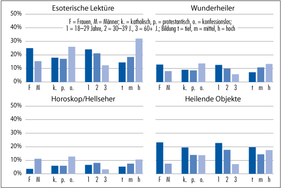 Fragestellung: «Haben Sie im letzten Jahr etwas vom folgenden gemacht? Ein Buch oder eine Zeitschrift zu Esoterik oder alternativer Spiritualität gelesen? Sich ein Horoskop erstellen lassen oder die Dienste eines Wahrsagers in Anspruch genommen? Techniken spiritueller Heilung verwendet oder die Dienste eines Heilers in Anspruch genommen? Den heilenden, schützenden oder Glück bringenden Einfluss von Objekten, wie z. B. Steinen, Kristallen oder Glücksbringern, genutzt ?»