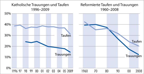 Linke Grafik: Geburten in % aller Geburten der Wohnbevölkerung; Trauungen in % aller Ziviltrauungen der Wohnbevölkerung; ohne das Bistum Basel.