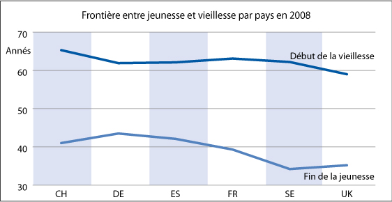Frontière entre jeunesse et vieillesse selon le pays en 2008