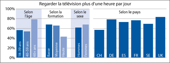 Questions posées : « Combien de temps passez-vous au total, durant un jour ouvrable ordinaire, à suivre des émissions télévisées ou radiodiffusées et à lire le journal ? Combien de temps passez-vous à utiliser l’internet ou la messagerie électronique pour votre usage personnel, que ce soit à domicile ou au travail ? »