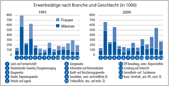 Erwerbstätige nach Branche und Geschlecht (in 1000) 1991 und 2009