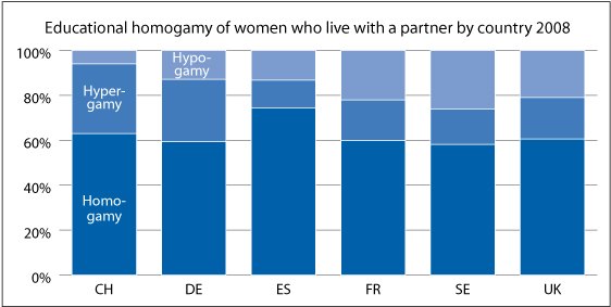 Hypergamy: the woman has a lower level of education than her male partner; hypogamy: the woman has a higher level of education than her male partner; homogamy: the woman has the same level of education as her male partner.