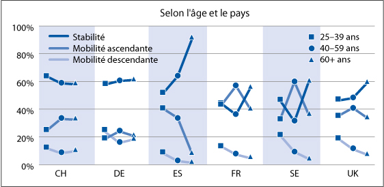 Le niveau de formation de chaque personne est comparé avec celui des deux parents (père ou mère) qui a le niveau de formation le plus élevé ; stabilité : la personne a le même niveau de formation ; mobilité ascendante : la personne a un niveau de formation plus haut ; mobilité descendante : la personne a un niveau de formation plus bas.