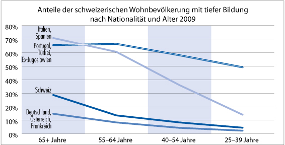 Anteile der schweizerischen Wohnbevölkerung mit tiefer Bildung nach Nationalität und Alter 2009