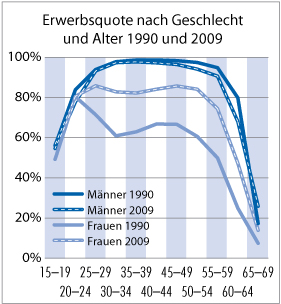 Erwerbsquote nach Geschlecht und Alter 1990 und 2009