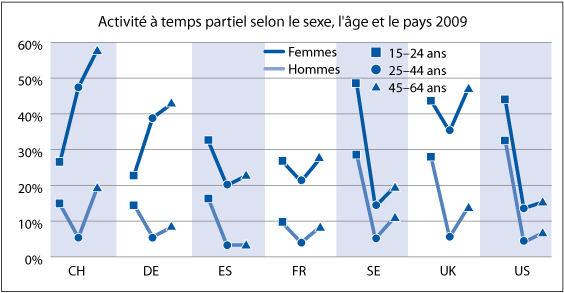 Activité à temps partiel selon le sexe, l’âge et le pays 2009