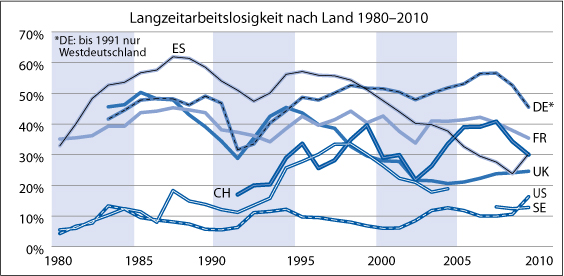Langzeitarbeitslosigkeit: mindestens ein Jahr arbeitslos in Prozent aller arbeitslosen Personen.