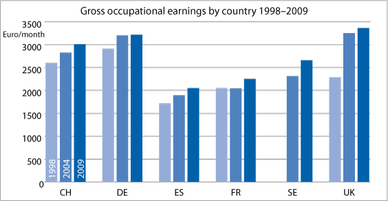Gross occupational earnings according to country 1998-2009, in euros per month, full-time employees in industry and services (without the public sector).