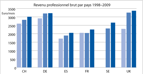 Revenu professionnel net par pays 1998-2009, en euros par mois, employés à plein temps dans l’industrie et les services (sans le secteur public).