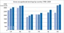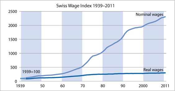 Nominal wages: wages (not adjusted for inflation) as a percentage of wages in 1939. Nominal wages until 1993 based on the result of the October Wage and Salary Survey. After 1994 based on data from the Central Office for Statistics under the Federal Law for Accident Insurance.