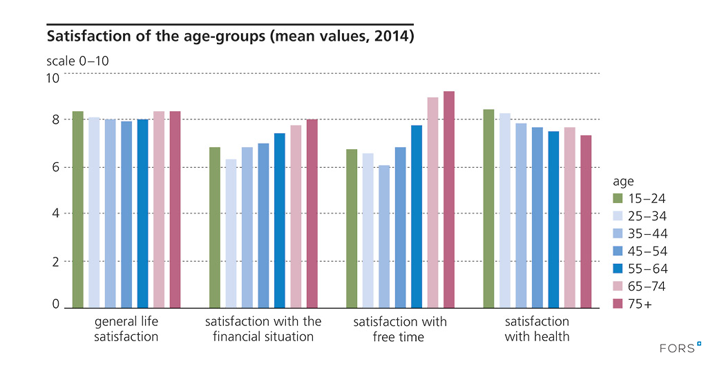 Question wording: “In general, how satisfied are you with your life? Overall how satisfied are you with your financial situation? How satisfied are you with the amount of free time you have/with your state of health? (0 means ‘not at all satisfied’ and 10 ‘completely satisfied’).”
