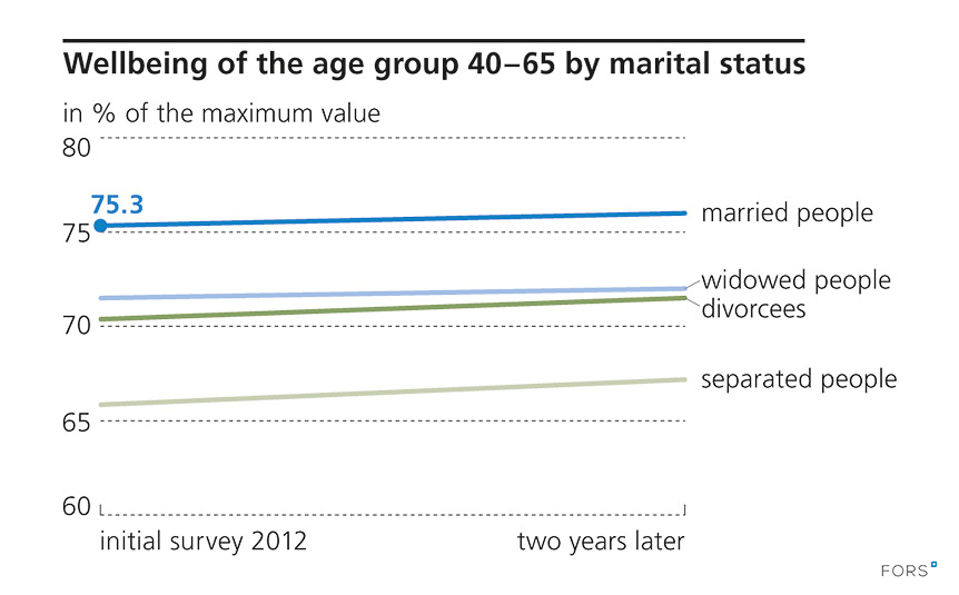 The values show the percentage share of the maximum value. Example of how to read the chart: On average, during the initial survey in 2012, married people reported a satisfaction value that corresponded to 75.3% of the maximum value (i.e. on a scale between 0 and 10, the average satisfaction value was 7.53).