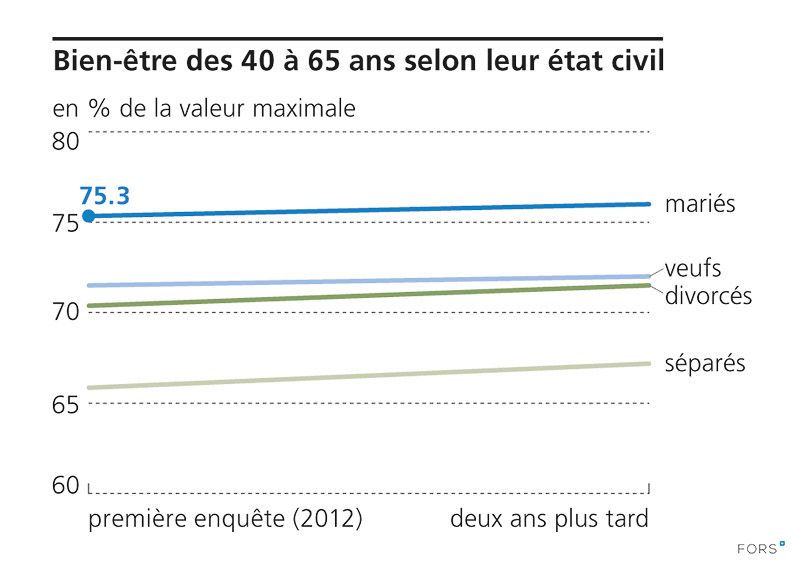 Les valeurs correspondent à la part (en %) de la valeur maximale. Exemple d’interprétation : sur la base des déclarations des personnes mariées interrogées dans le cadre de la première enquête (2012), leur niveau de satisfaction s’établissait, en moyenne, à 75,3% de la valeur maximale (sur une échelle de 0 à 10, leur niveau de satisfaction était donc, en moyenne, de 7,53).