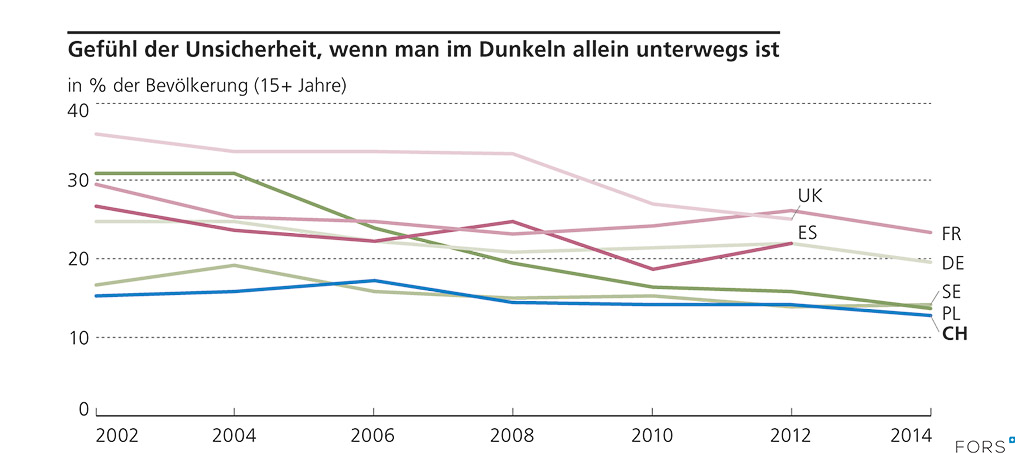 Fragestellung: Unsicherheit: «Wie sicher fühlen Sie sich – oder würden Sie sich fühlen – wenn Sie in ihrer Wohngegend nach Einbruch der Dunkelheit allein zu Fuss unterwegs sind oder wären?» Antwortkategorien: «sehr sicher», «sicher», «unsicher», «sehr unsicher». Opfererfahrung: «Wurden Sie oder ein Mitglied Ihres Haushalts in den letzten 5 Jahren Opfer eines Einbruchs oder eines Angriffs?» (Ja, nein).
