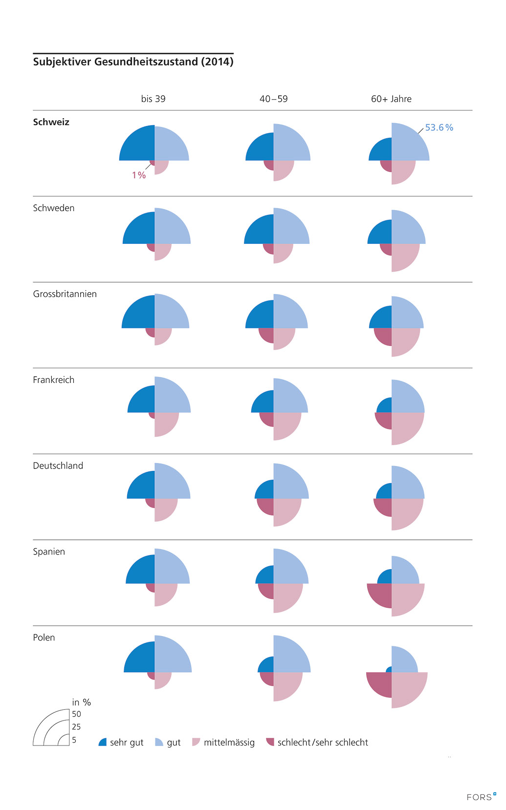 Fragestellung: «Wie schätzen Sie ihre eigene Gesundheit ein?» Antwortkategorien: sehr gut, gut, mittelmässig, schlecht, sehr schlecht.