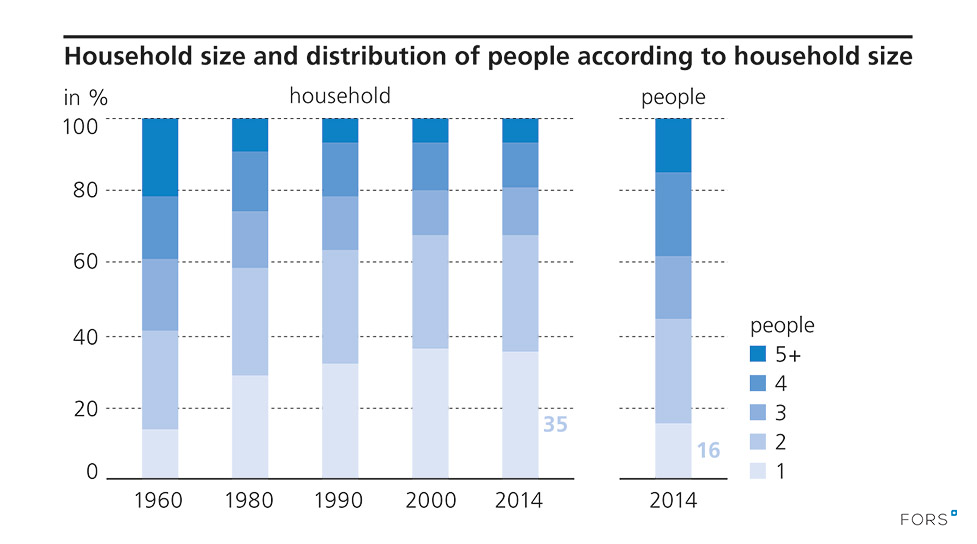 Only people who live in private households (excluded: people living in retirement and nursing homes, prison inmates, monasteries, etc.). Example of how to read the chart: In 2014, 35% of all households are one-person households, but only 16% of all people (of the resident population) live in one-person households.